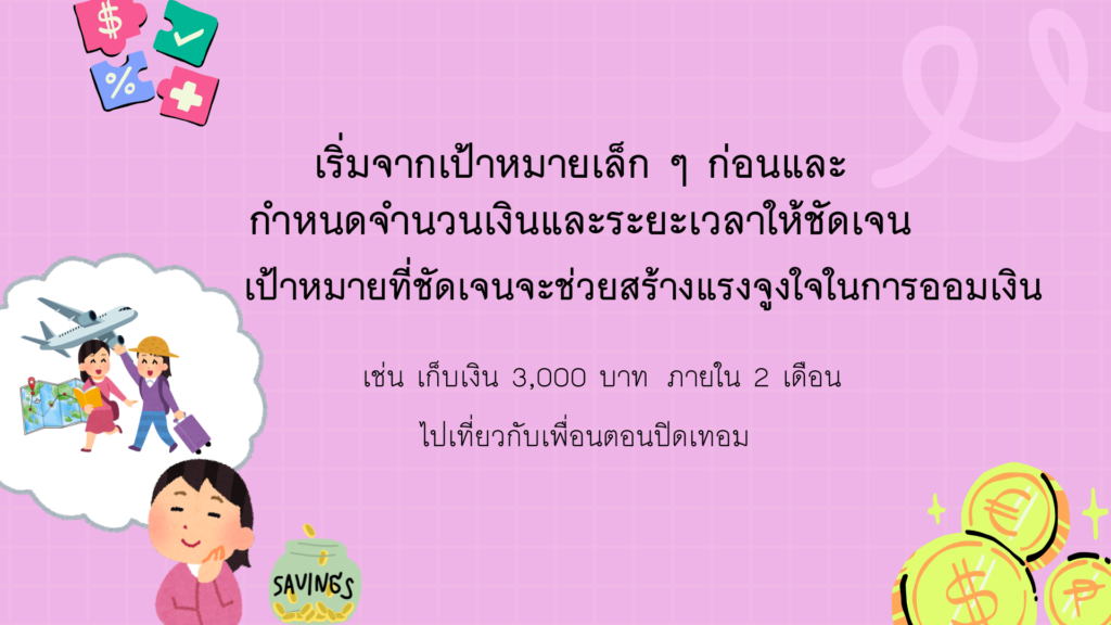 เริ่มจากการตั้งเป้าหมายเล็ก ๆ ระยะสั้นก่อน และกำหนดเป้าหมายให้ละเอียดชัดเจน เช่น เก็บเงิน 3,000 บาท เพื่อไปเที่ยวกับเพื่อนตอนปิดเทอม หรือเป้าหมายในระยะยาว เช่น ออมเงินเพื่อศึกษาต่อ เมื่อเรามีเป้าหมายที่ชัดเจนรู้ว่าต้องออมเท่าไหร่ในต่อสัปดาห์หรือต้องใช้เวลานานแค่ไหน จะช่วยให้เรามีทิศทางไม่หลงทางในการใช้จ่าย