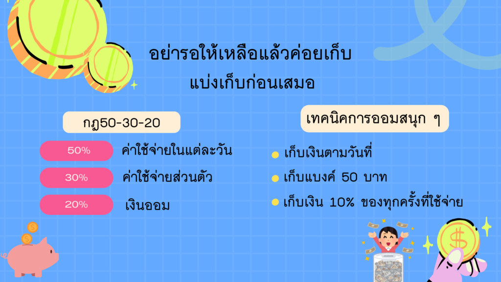 หลายคนใช้วิธี “เหลือค่อยเก็บ” แต่ในความเป็นจริงมักจะไม่เหลือ ลองเปลี่ยนเป็น “แบ่งเก็บก่อน” โดยคำนวณรายได้แล้วจัดสรรว่าจะใช้เท่าไร ออมเท่าไร ไม่ต้องเยอะมาก อาจเริ่มออมเดือนละ 200-500 บาท สิ่งสำคัญคือ วินัยและความสม่ำเสมอ อีกวิธีคือการแยกบัญชี บัญชีเงินใช้และบัญชีเงินออม หรือหากใช้เงินสด อาจแยกกระเป๋าเงิน เพื่อไม่ให้ใช้เกินตัว
