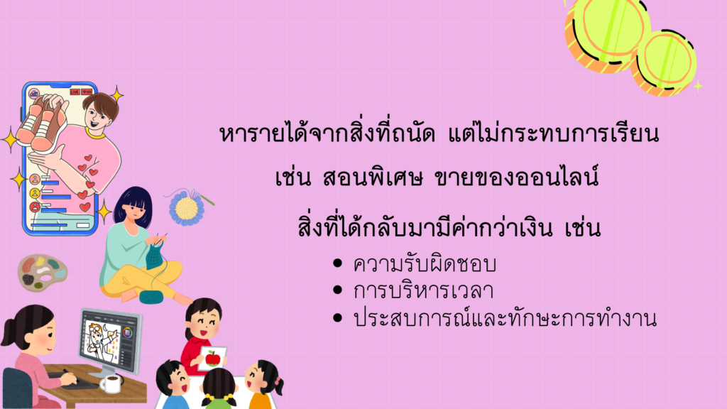 หากมีอาชีพเสริมเพิ่มด้วยยิ่งดี ในปัจจุบันมีเทคโนโลยีเข้ามาอำนวยความสะดวก ทำให้ทุกคนเข้าถึงและสร้างอาชีพได้ง่าย ๆ ลองหารายได้เสริมจากสิ่งที่ชอบและไม่กระทบการเรียน เช่น สอนพิเศษรุ่นน้อง ขายของออนไลน์ ทำชีทสรุปขาย งานเล็ก ๆ เหล่านี้แม้จะได้เงินไม่มาก แต่สิ่งที่ได้กลับมาคือประสบการณ์ เช่น ความรับผิดชอบ การบริหารเวลา การสื่อสารกับลูกค้า อย่างไรก็ตาม การเริ่มทำธุรกิจเล็ก ๆ ตั้งแต่อายุน้อย ไม่จำเป็นต้องสำเร็จทันที แต่บทเรียนและประสบการณ์เหล่านี้หาไม่ได้จากในห้องเรียน