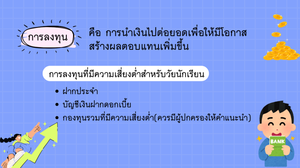 นอกจากการออมแล้ว การวางแผนลงทุนยังช่วยเพิ่มมูลค่าเงินในระยะยาว การลงทุน คือการนำเงินไปต่อยอด เพื่อให้มีโอกาสสร้างผลตอบแทนเพิ่มขึ้น แทนที่จะปล่อยเงินไว้อย่างเดียว แต่ควรศึกษาและเริ่มจากรูปแบบที่มีความเสี่ยงต่ำ เช่น ฝากประจำ บัญชีเงินฝากดอกเบี้ย กองทุนรวมที่มีความเสี่ยงต่ำ(ควรมีผู้ปกครองให้คำแนะนำ) หรือบางคนอาจสนใจหุ้น แต่ต้องศึกษาให้เข้าใจพื้นฐานก่อน และไม่ใช้เงินทั้งหมดไปกับสิ่งที่ยังไม่เข้าใจดีพอ สิ่งสำคัญคือ ควรมีเงินออมสำรองก่อน แล้วค่อยเรียนรู้เรื่องการลงทุนอย่างจริงจัง