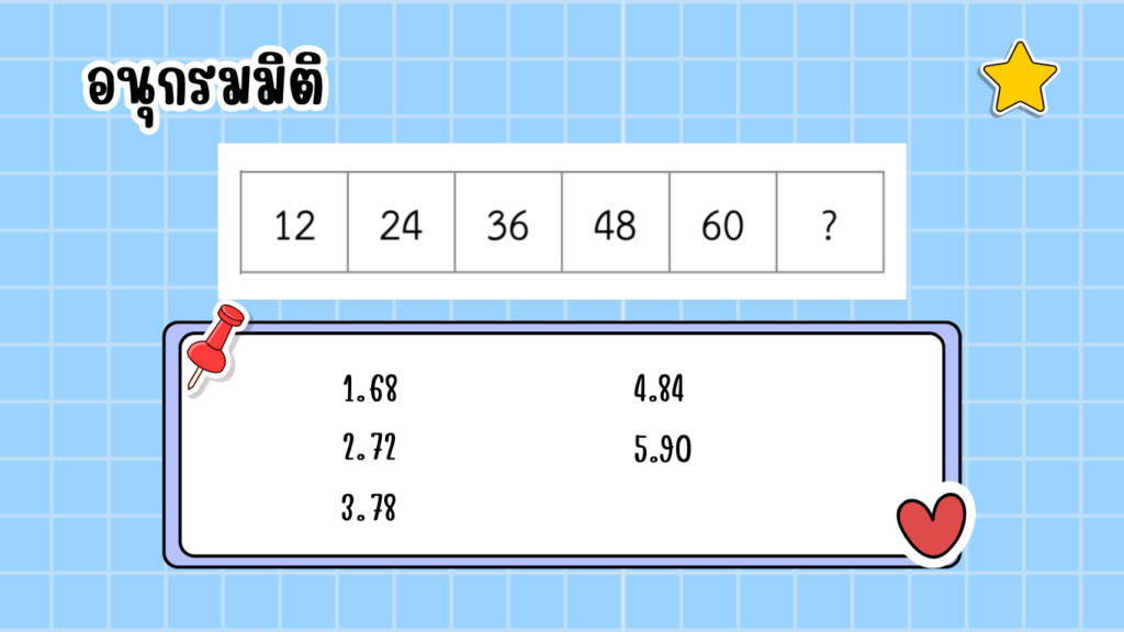 จะเป็นส่วนที่ออกอนุกรมตัวเลข เพื่อน ๆ ต้องดูความสัมพันธ์ของตัวเลขให้เร็ว ซึ่งในโจทย์แบบนี้ให้เราลองบวกลบก่อนแล้วค่อยเทียบกับจำนวนถัดไป หากไม่สามารถระบุความสัมพันธ์ได้ให้ลองเปลี่ยนเป็นคูณหาร หรือยกกำลัง
