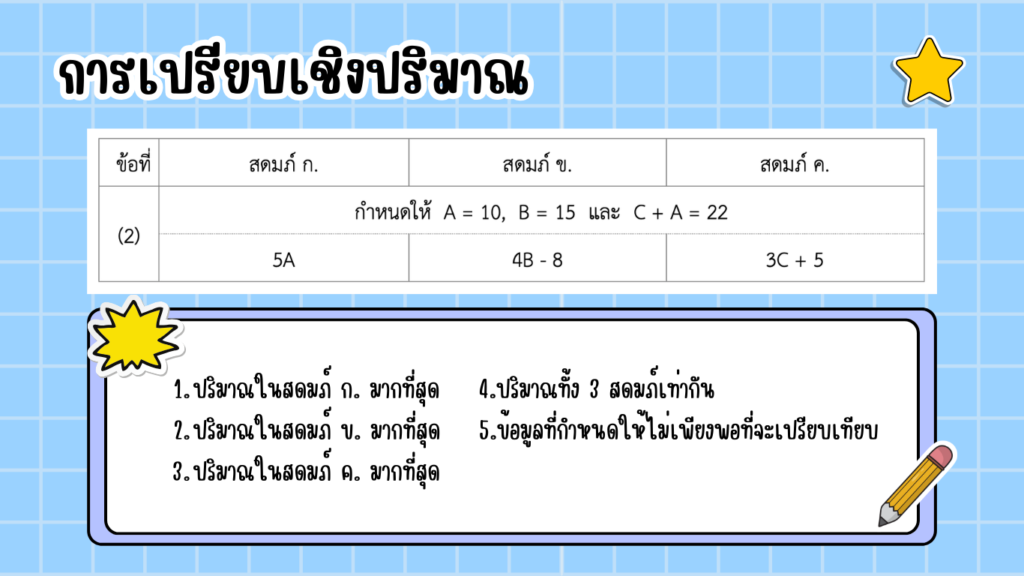 ตรงส่วนนี้จะให้โจทย์เป็นตารางแบ่งเป็น 3 คอลัมน์ โดยจะเรียกแต่ละคอลัมน์ว่า สดมภ์ แล้วตามด้วยชื่อ ในตารางจะมีการกำหนดตัวแปร และโจทย์เพื่อให้หาค่าและแทนค่า และเปรียบเทียบคำตอบที่ได้ ซึ่งเนื้อหาจะครอบคลุมความรู้คณิตศาสตร์ขั้นพื้นฐาน เช่น