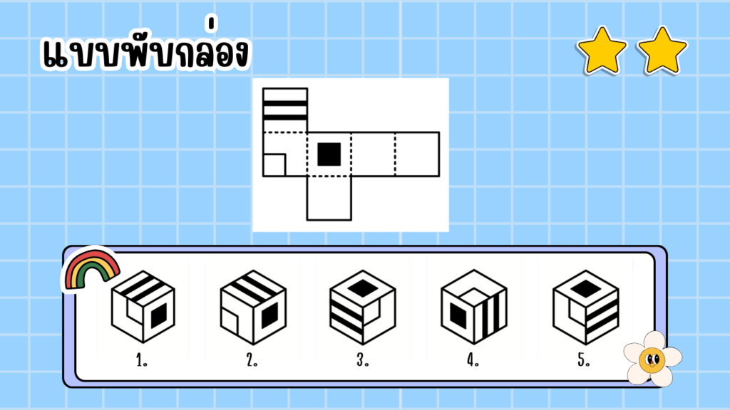 โจทย์ประเภทนี้จะกำหนดภาพกล่องทรงสี่เหลี่ยมที่ถูกคลี่ออก เราต้องประกอบภาพดังกล่าวให้ถูกต้อง ให้เรานึกถึงเกมสร้างบ้านผสมกับเกมจำผิด เวลาที่สร้างบ้านจะเราหมุนวัตถุไปมาเพื่อให้ได้มุมที่ต้องการสำหรับตกแต่ง และหากมีอะไรที่ผิดปกติเราจะจับสังเกตได้ เช่นเดียวกันเราจะใช้เทคนิคทั้งการหมุนและการจับผิดภาพตามวิธีนี้
