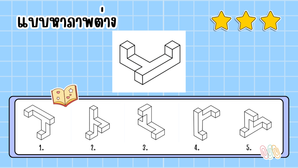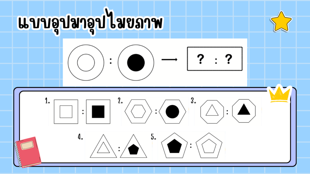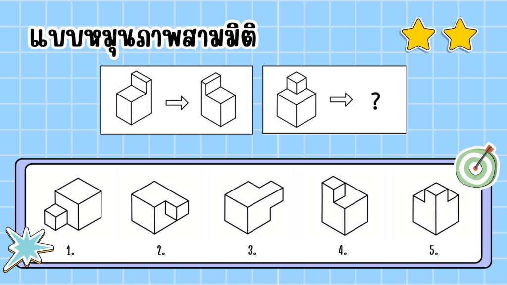 โจทย์จะให้ภาพตัวอย่าง 1 คู่ และภาพโจทย์อีก 1 คู่ คล้ายกับแบบหมุนสามมิติเลยใช่ไหมคะ แต่โจทย์นี้จะไม่ได้มีแค่การหมุนเพียงอย่างเดียว แต่จะเพิ่มลูกเล่นอื่น เช่น การเปลี่ยนสี การเปลี่ยนขนาดหรือรูปร่าง การย้ายตำแหน่ง การพลิก เป็นต้น ในโจทยนี้จะอาศัยสายตาและการอุปมาของเราว่าที่ได้ถูกต้องหรือไม่ ดังนั้น หากลองฝึกทำพลิก หมุน หรือจับผิดภาพบ่อย ๆ ก็สามารถทำข้อสอบได้แล้วค่ะ!