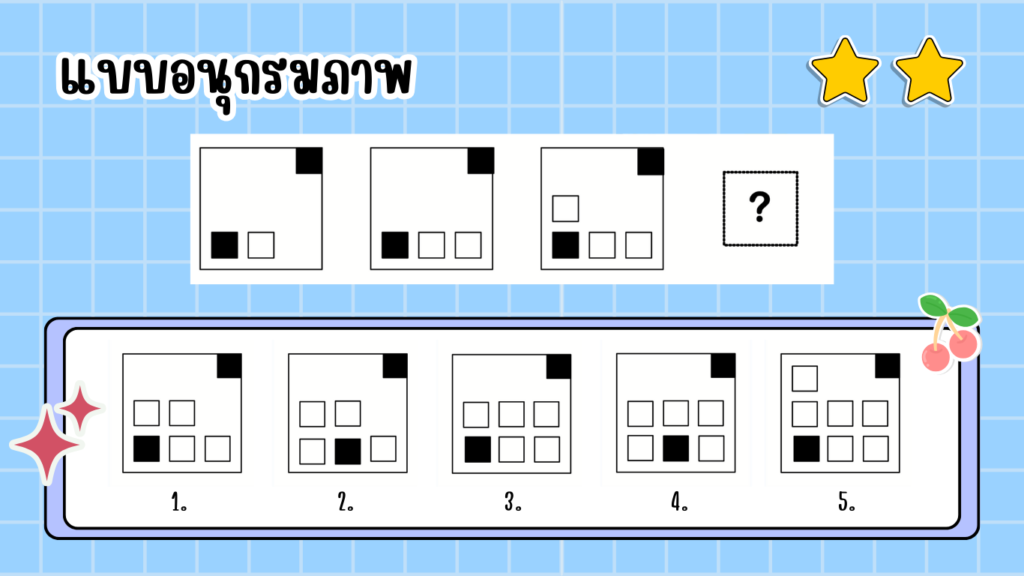 โจทย์อนุกรมภาพ จะมีแพทเทิร์นที่ค่อนข้างตายตัว เพื่อน ๆ ลองฝึกจับแพทเทิร์นบ่อย ๆ รับรองว่าง่ายเหมือนปอกกล้วยแน่นอน